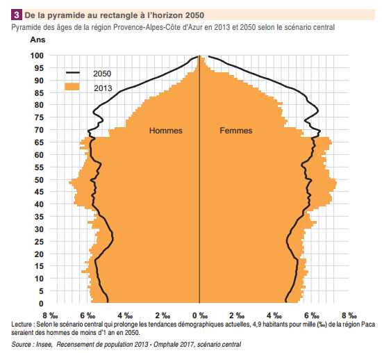 Si les tendances démographiques récentes se maintenaient, la région Provence-Alpes-Côte d’Azur compterait autour de 5,3 millions d’habitants en 2050, soit 375 000 de plus qu’actuellement. Avec l’arrivée aux grands âges des générations issues du baby-boom, la structure par âge de sa population serait largement modifiée.