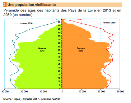 À l’image de la France métropolitaine, la population des Pays de la Loire vieillirait avec l’arrivée aux âges avancés de la génération baby-boom. Selon le scénario central, la part des 65 ans ou plus atteindrait 28 % en 2050, soit 10 points de plus qu’en 2013. Dans la région, la moyenne d’âge s’élèverait à 45 ans en 2050, contre 40 ans en 2013.