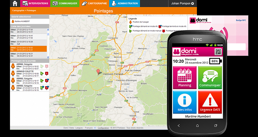 Une application spécialisée, l’application « DOMI », permet en effet aux intervenants de « badger » au début de leur intervention chez un usager et à la fin. Ceci est possible grâce à un autocollant magnétique que l’on place au domicile de la personne chez qui se fait l’intervention. Les données concernant les horaires et le temps de l’intervention sont ainsi transmis automatiquement.