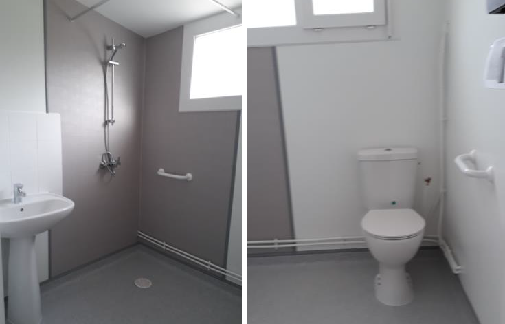 Exemple d’aménagements réalisés dans les appartements CLESENCE : douche PMR (Personne à Mobilité Réduite) [à gauche] et toilettes avec barre de maintien [à droite]