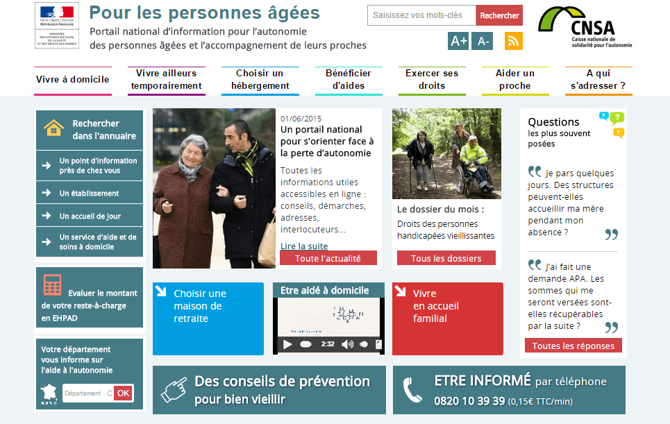 Sous l’égide de la CNSA, ce site internet a pour vocation de rassembler les informations utiles aux personnes âgées en perte d’autonomie et à leurs aidants. Un numéro de téléphone spécial a également été lancé, en complément du site, pour répondre aux questions des usagers qui souhaitent un contact direct.