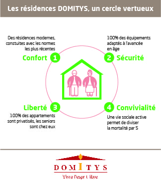 Selon Domitys, le concept qu’il a conçu et lancé en 2001 « répond aux attentes des seniors qui souhaitent pour 90% d’entre eux vieillir chez eux ». Les résidences sont construites selon les dernières normes en vigueur et l’ensemble des équipements qui les composent adaptés à l’avancée en âge. Les appartements sont privatifs et les espaces communs conçu pour favoriser « une vie sociale riche et la pratique d’activités physiques, culturelles et de loisirs à la fois au sein et à l’extérieur de la résidence ».