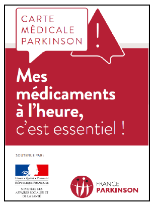 Carte médicale ParkinsonPour faciliter la transmission des informations sur leur pathologie et leurs prises médicamenteuses habituelles, l’association recommande aux malades de se munir de la carte médicale Parkinson. La carte médicale Parkinson doit être complétée avec les informations de traitements suivis (médicaments, posologies, heures de prises) et les personnes à prévenir en cas d’urgence (proches, médecins).