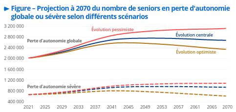 - Scénario pessimiste : si la santé stagne, la France dépasserait 3,1 millions de personnes dépendantes, dont plus d’un million en perte sévère.