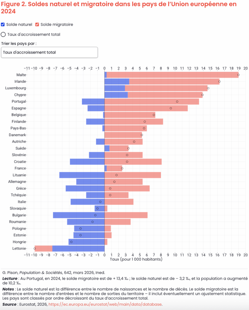 Dans ce contexte de vieillissement marqué, l’article de Gilles Pison publié par l’Institut National d’Etudes Démographiques (ined) et paru dans Populations et Sociétés, met en évidence un point clé : la croissance de la population française et européenne repose aujourd’hui davantage sur les mouvements migratoires que sur un excédent des naissances. Comme pour l’Union européenne dans son ensemble, où le solde naturel est devenu négatif depuis 2012, la France connaît un nombre croissant de décès par rapport aux naissances. Sans un solde migratoire positif – qui compense et dépasse l’excédent des décès sur les naissances – la population diminuerait rapidement.