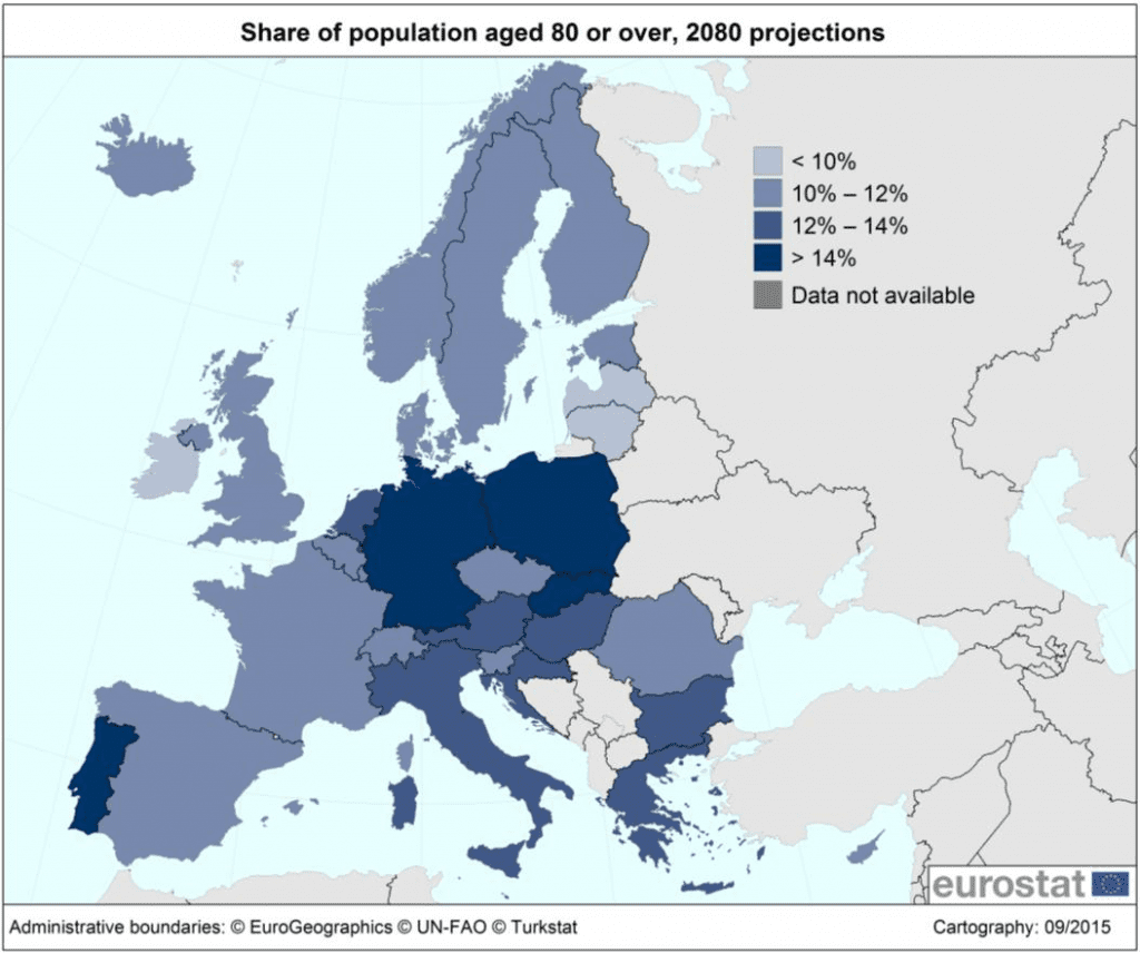 En 2014, la proportion de personnes âgées de 65 ans ou plus au sein de l’Union Européenne a atteint 18,5%. Ce pourcentage devrait encore augmenter à l’avenir pour atteindre près de 30% en 2080.