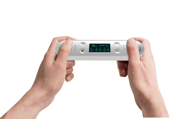 MyECG® pèse 100 grammes et peut tenir dans une poche, ce qui le rend très maniable. Cet électrocardiogramme portable se distingue par sa simplicité et sa facilité d’utilisation. Pour l’utiliser, il suffit de positionner le pouce et l’index sur des électrodes situées de chaque côté du boîtier.