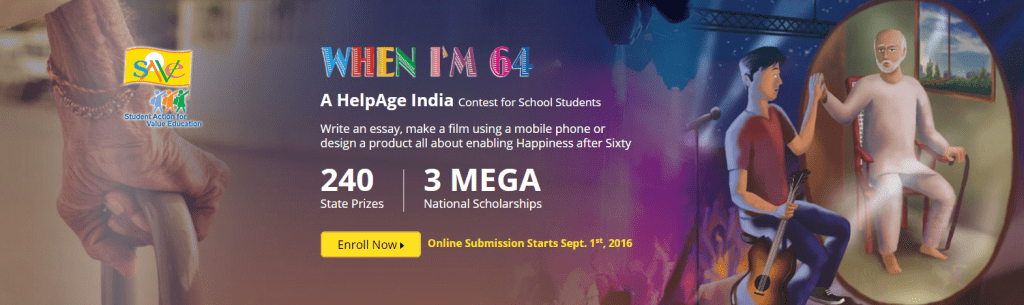 Le concours « When I’m 64 » (Quand j’aurai 64 ans), lancée par l’association, est ouvert aux étudiants et écoliers indiens uniquement, issus des classes de quatrième, troisième et seconde (« 8th, 9th et 10th grades » en Inde). Il invite à réfléchir aux thématiques du bien-vieillir, du quotidien des personnes âgées mais aussi de l’expérience bénéfique que celles-ci peuvent nous apporter.